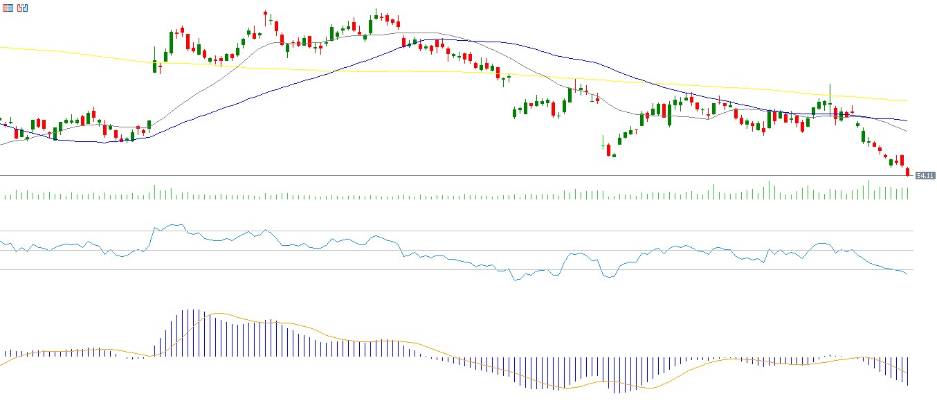 Technically, the Relative Strength Index (RSI) is around 26 points, placing the stock in oversold territory and indicating negative momentum. The MACD indicator also shows a bearish crossover between the blue MACD line and the orange signal line, reinforcing the negative momentum.