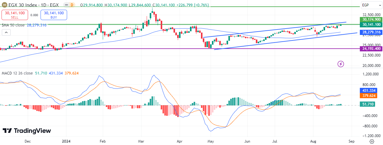 The Egyptian main index, EGX30, rose to 30,174 points yesterday, marking its highest level since March 18, 2024, before closing at 30,141 points. The index has also increased by about 25% since hitting its lowest point on May 1, 2024, when it recorded 24,192 points up until yesterday’s close. Based on this performance, the EGX30 index can be considered to be in a bull market.