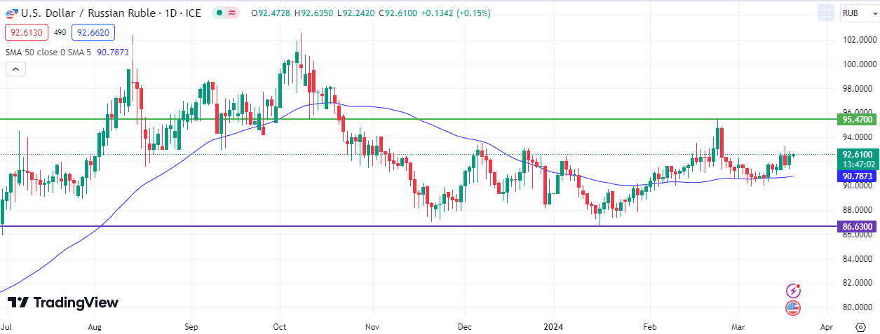 Currently, it is trading at the 92 levels, with indications of a prevailing horizontal sideways trend, marked by a minimum of 86.63 on January 16, 2024, and a maximum of 95.47 on February 23, 2024.