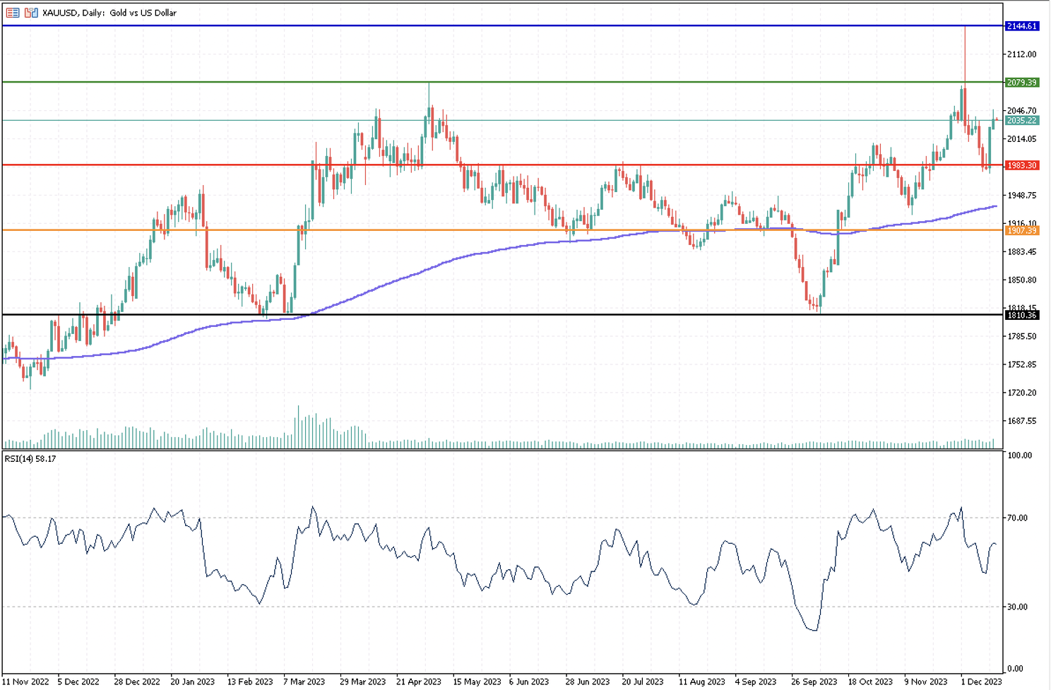 The catalyst for the rally was the Fed’s post-FOMC meeting statement, which signalled a potential end to its aggressive monetary tightening cycle. While interest rates remained unchanged for the third consecutive meeting, most Fed officials (17 out of 19) projected lower rates by the end of 2024. This dovish tilt sent shockwaves through the market, with investors racing to adjust their positions. Some analysts consider this extremely positive for gold prices as lower interest rates reduce the opportunity cost of holding non-yielding gold and weaken the dollar, making it a more attractive investment.