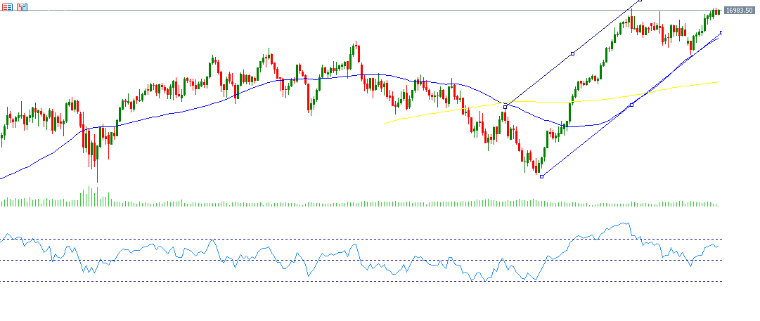 From a technical standpoint, it appears that the upward trend is prevailing, and the GOLDEN CROSS is still in place between the 50-day moving average in blue at 16,551 points and the 200-day moving average in yellow at 15,935 points, indicating upward momentum for the German DAX index. As for the Relative Strength Index (RSI), it recorded approximately 65 points, which exceeds the level of 50 points, which indicates positive momentum for the DAX index.