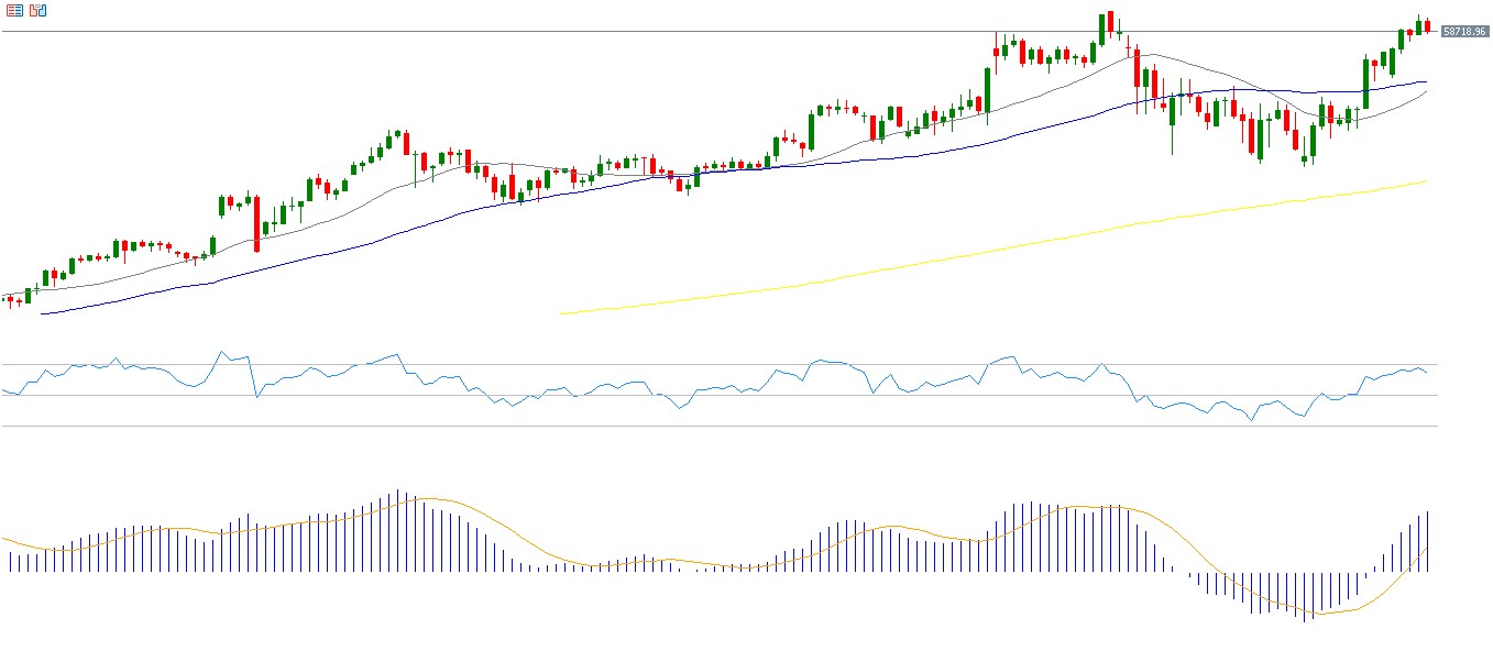 The Relative Strength Index (RSI) currently stands at 62, indicating bullish momentum for the index.