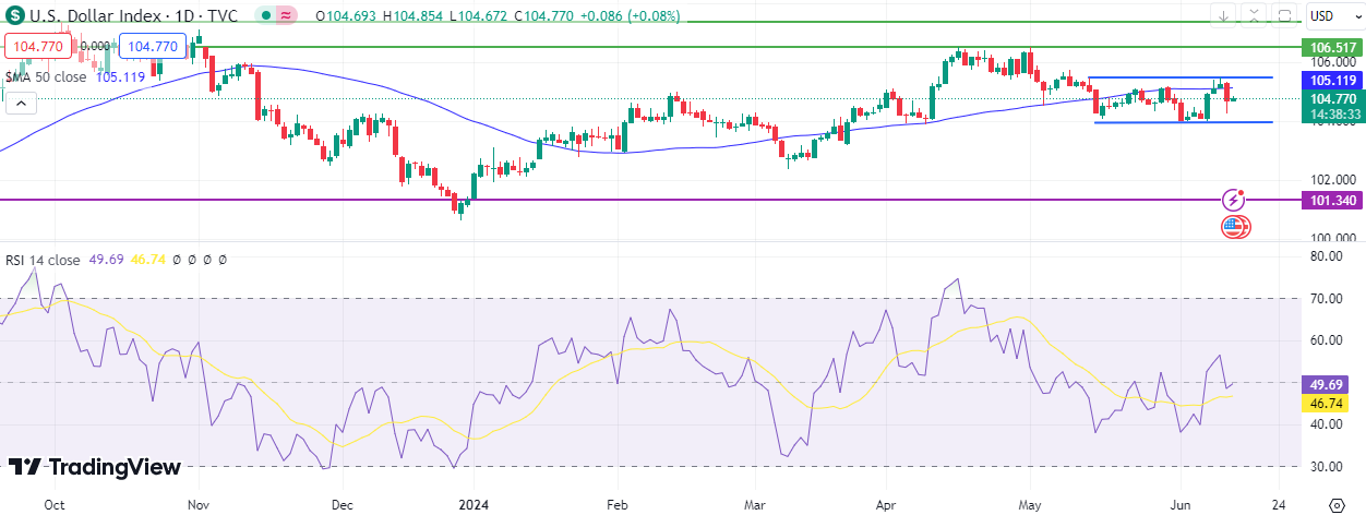 The US dollar index emerged as the biggest loser, recording 104.25 points yesterday and currently hovering near 104.75 points. Technically, it appears that a consolidation trend is prevailing for the US Dollar Index at this stage, as it trades around the 104 to 105 points range. The biggest challenge lies in breaching the 50-day moving average, which stands at 105.11 points. Meanwhile, the Relative Strength Index (RSI) indicates neutrality for the dollar index, recording 50 points.