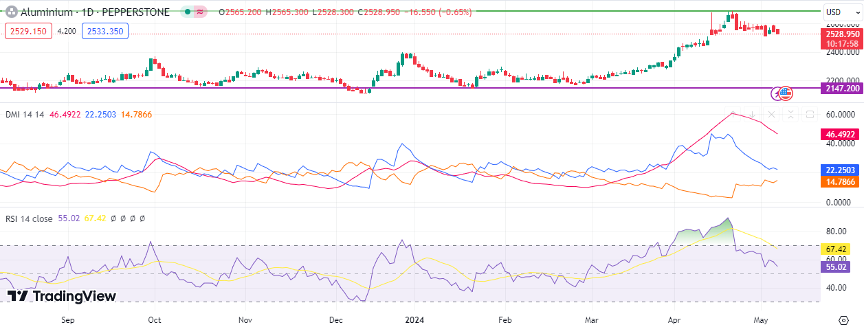 From a technical standpoint, it appears that the upward trend in aluminum prices will persist in the next stage. There is consistency in the 20-, 50-, and 200-day moving averages, all showing an upward trend, with the 20-day average exceeding the 50-day average, and the 50-day average exceeding the 200-day average. The positive movement index (DMI+) is approximately 22 points, compared to the negative movement index (DMI-), which is approximately 14 points. It is noteworthy that there is a significant gap between these two indicators, indicating strong purchasing pressure on aluminum. Moreover, the ADX trend strength index is about 46 points, which is more than 25 points, signifying that the momentum of this upward trend is strong. The Relative Strength Index (RSI) also indicates positive momentum for aluminum, recording approximately 56 points, which is above the 50 level.