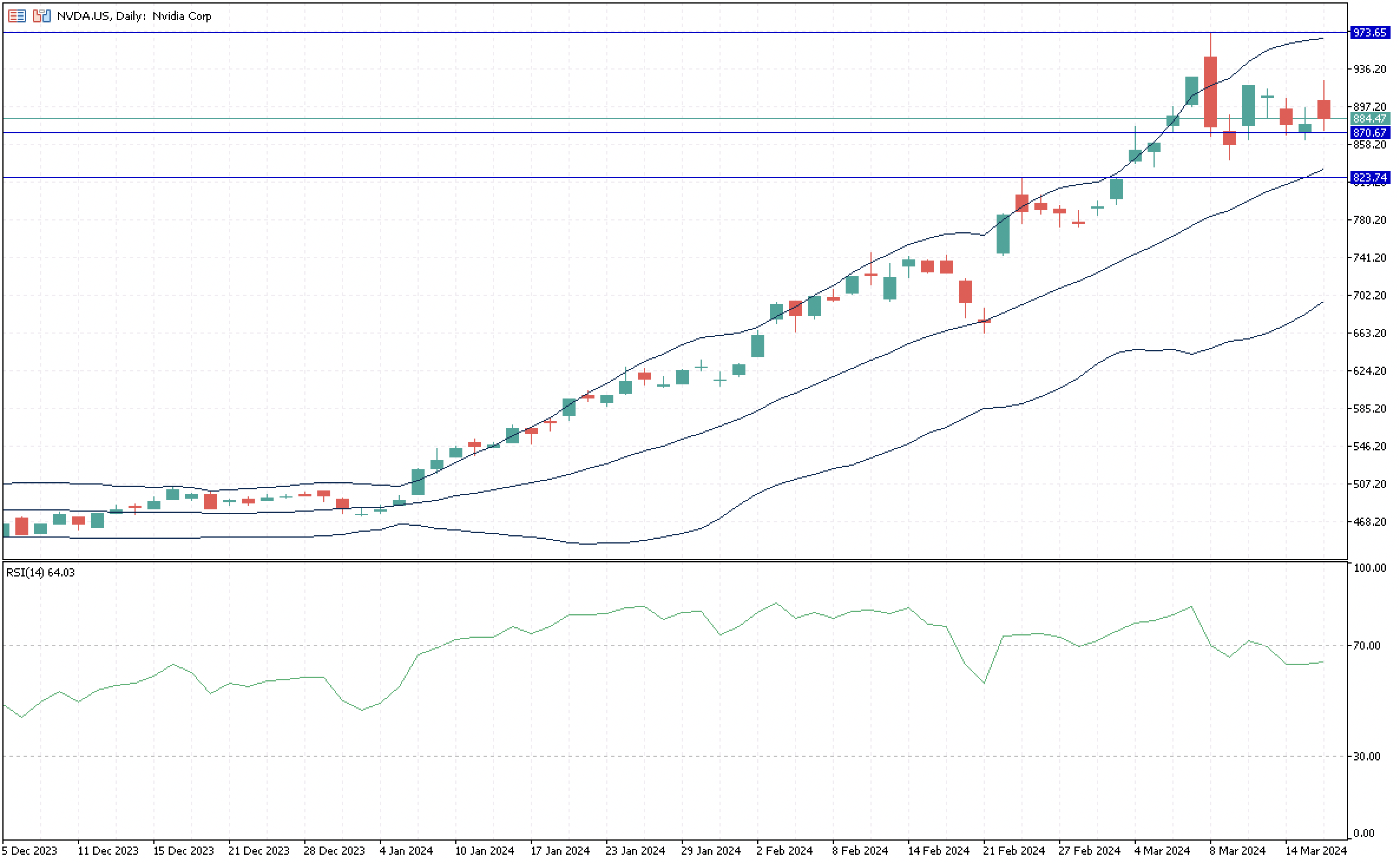 With its stock up 79% at Monday closing since the beginning of the year, Nvidia is now in a consolidation phase after being in an overbought condition as shown by the RSI indicator and reaching an all-time high earlier in the month at $973.65, which is now the closest resistance to the price. Volatility has been increasing, as shown by the Bollinger Dands, and the price keeps hovering above the weekly technical level of $870.67. As a second and third support, the stock has its 20-day moving average at $831.90 and $823.74, respectively.