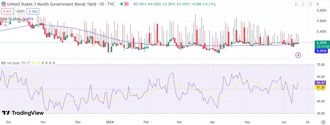 From a technical perspective, the 3-month Treasury bond yield is trading in a horizontal pattern near the 5.40% level. The momentum for this short-term yield is bullish, as suggested by the relative strength index, which is presently at 53 points.