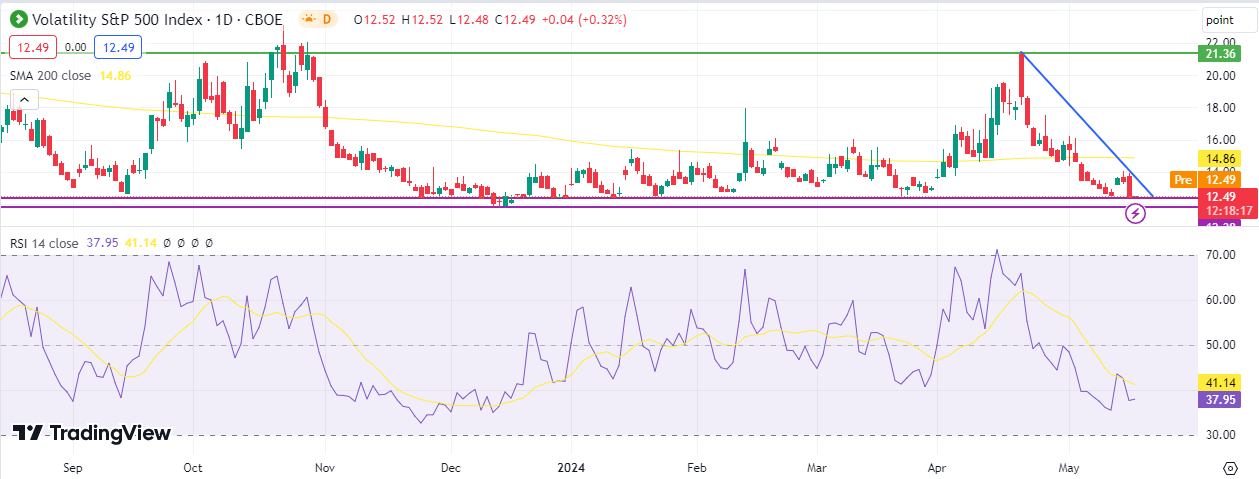 From a technical standpoint, it seems that the downward trend for the VIX index is prevailing in the next stage, with the next challenge for the VIX index being reaching the support level of 11.81 points. The Relative Strength Index (RSI) also indicates negative momentum for the VIX index, recording approximately 38 points.
