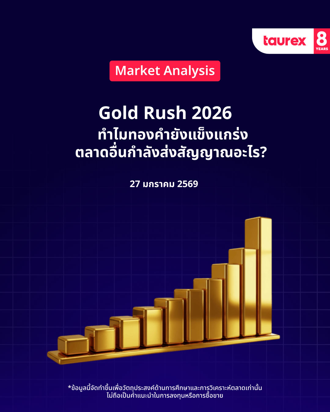 - แนวโน้มขาขึ้นยังคงแข็งแกร่ง : ราคาทะลุ $5,000 ต่อออนซ์ โดยมีเป้าหมายถัดไปที่ $5,100 และ $5,200 ตามลำดับ