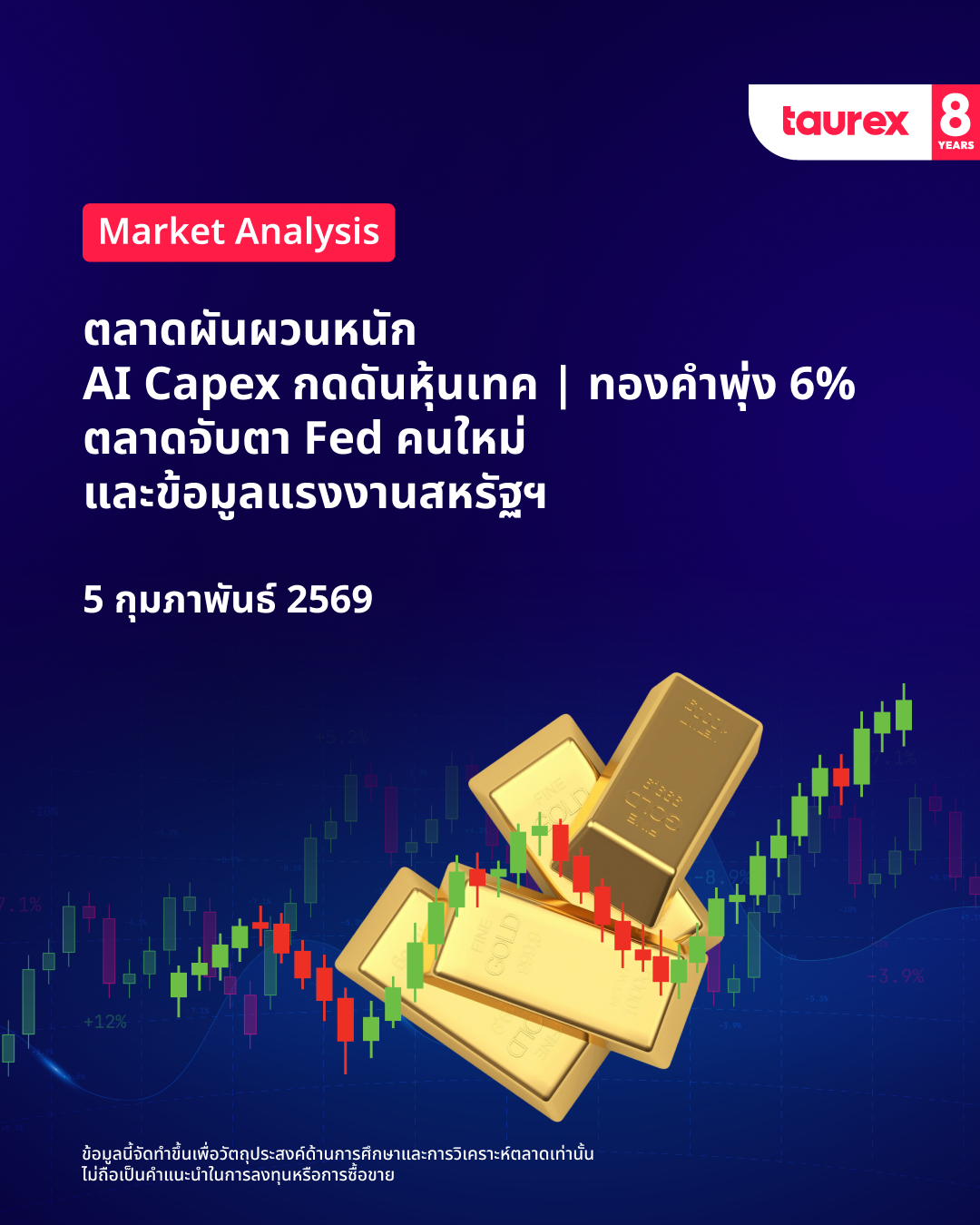 ตลาด CFD วันที่ 5 กุมภาพันธ์ 2026 เผชิญความผันผวนระดับสูงจากปัจจัยพื้นฐานที่ทับซ้อนกันหลายประการ โดยธีมหลักที่ครอบงำตลาดในสัปดาห์นี้ประกอบด้วย การเทขายหุ้นเทคโนโลยีและ AI ทั่วโลก ความไม่แน่นอนด้านนโยบายการเงินหลังประธานาธิบดี Trump เสนอชื่อ Kevin Warsh เป็นประธาน Fed คนใหม่ ความตึงเครียดภูมิรัฐศาสตร์สหรัฐฯ-อิหร่าน และการรอตัวเลขจ้างงานนอกภาคเกษตร (NFP) ที่จะประกาศในวันศุกร์นี้