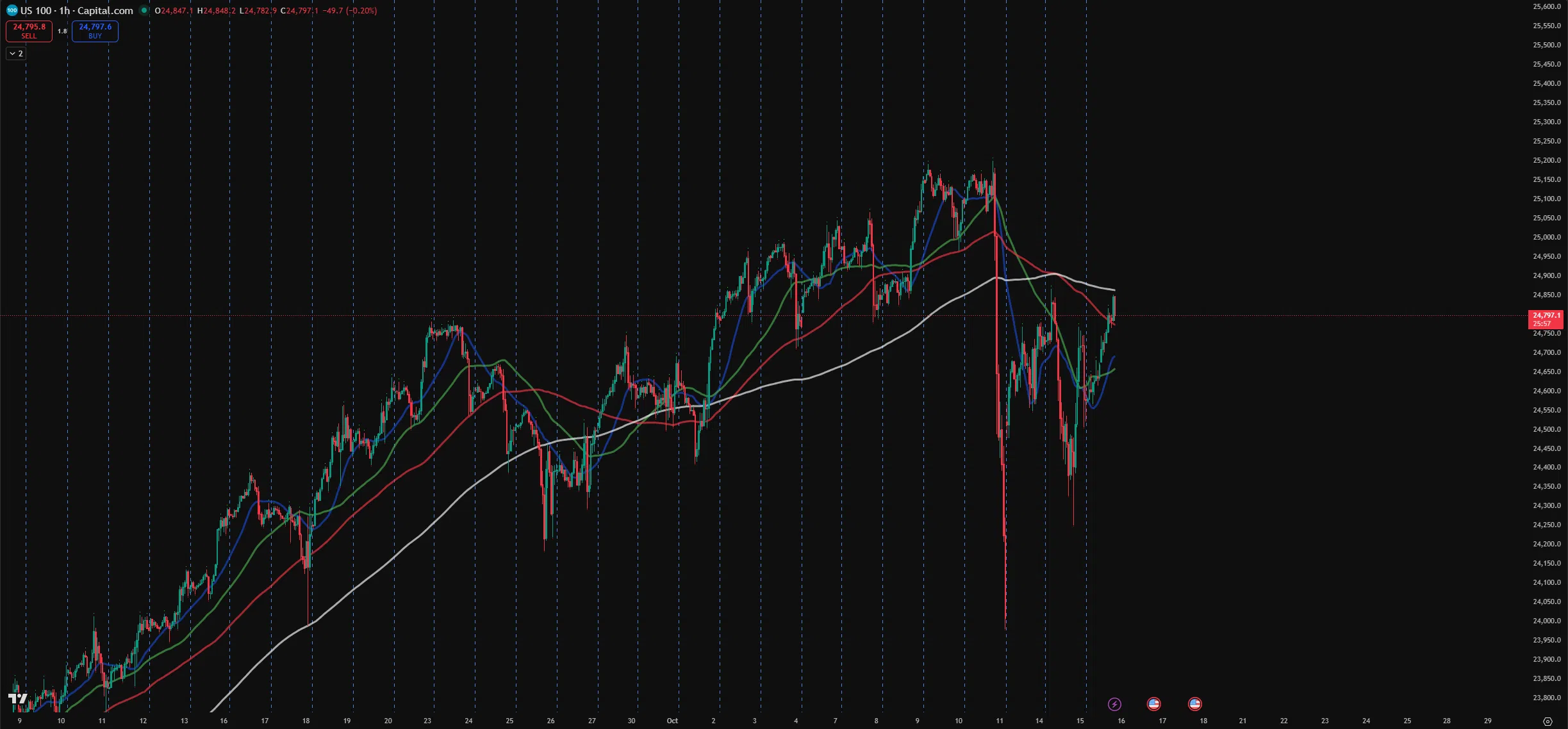 ดัชนี NASDAQ 100 ปิดการซื้อขายในวันที่ 14 ตุลาคม 2025 ที่ระดับ 24,695.53 จุด ปรับตัวลดลง 0.22% ท่ามกลางความผันผวนสูงจากปัจจัยสำคัญหลายประการที่ส่งผลกระทบต่อตลาดในปัจจุบัน นโยบายการเงินของธนาคารกลางสหรัฐฯยังคงเป็นแรงขับเคลื่อนหลัก โดยประธาน Fed Jerome Powell ได้ส่งสัญญาณชัดเจนถึงการลดอัตราดอกเบี้ยต่อเนื่อง โดยตลาดคาดการณ์ด้วยความมั่นใจเกือบ 100% ว่า Fed จะปรับลดดอกเบี้ยอีก 25 bps ในการประชุมวันที่ 28-29 ตุลาคมนี้ จากระดับปัจจุบัน 4.00%-4.25% ลงมาที่ 3.75%-4.00% ซึ่งจะช่วยลดต้นทุนการกู้ยืมและสนับสนุนการเติบโตของภาคเทคโนโลยี