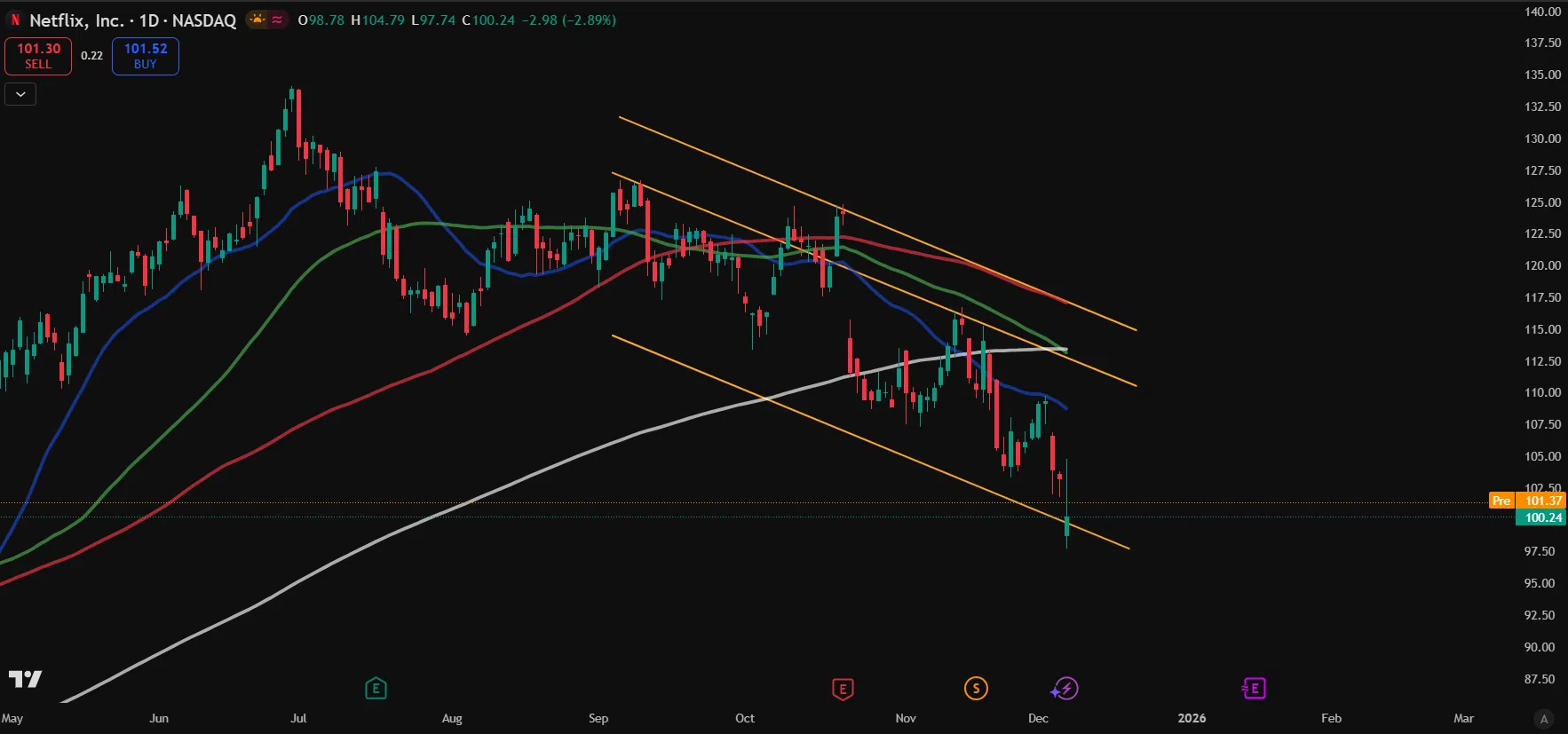 โซนสำคัญที่ต้องจับตา: แนวรับ $97.70-100.00 และแนวต้าน $104.80-105.40 เป็นกรอบราคาที่สำคัญที่สุดในระยะสั้น การเคลื่อนไหวของราคาภายในกรอบนี้จะเป็นตัวกำหนดทิศทางถัดไปของ NFLX