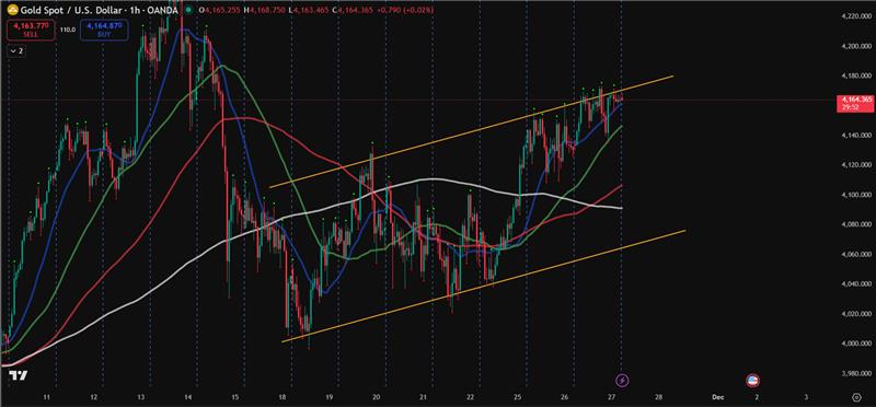 ราคาทองคำ (XAUUSD) ปรับตัวขึ้นแตะระดับสูงสุดในรอบกว่าหนึ่งสัปดาห์ โดยซื้อขายอยู่บริเวณ $4,162-4,170 ต่อออนซ์ ท่ามกลางความคาดหวังที่เพิ่มขึ้นว่าธนาคารกลางสหรัฐฯ (Fed) จะปรับลดอัตราดอกเบี้ยในการประชุมเดือนธันวาคม โดยข้อมูลจาก CME FedWatch Tool ชี้ว่าโอกาสการลดดอกเบี้ย 25 basis points พุ่งขึ้นแตะ 85% จากระดับเพียง 30% เมื่อสัปดาห์ก่อน ปัจจัยหนุนสำคัญมาจากข้อมูลเศรษฐกิจสหรัฐฯ ที่ออกมาอ่อนแอกว่าคาด โดยดัชนีความเชื่อมั่นผู้บริโภคเดือนพฤศจิกายนปรับตัวลดลง ขณะที่ตัวเลขการยื่นขอสวัสดิการว่างงานรายสัปดาห์ลดลงสู่ระดับ 216,000 ราย ซึ่งต่ำสุดนับตั้งแต่เดือนเมษายน สะท้อนภาพตลาดแรงงานที่ยังคงทรงตัวแต่เริ่มชะลอการจ้างงานใหม่
