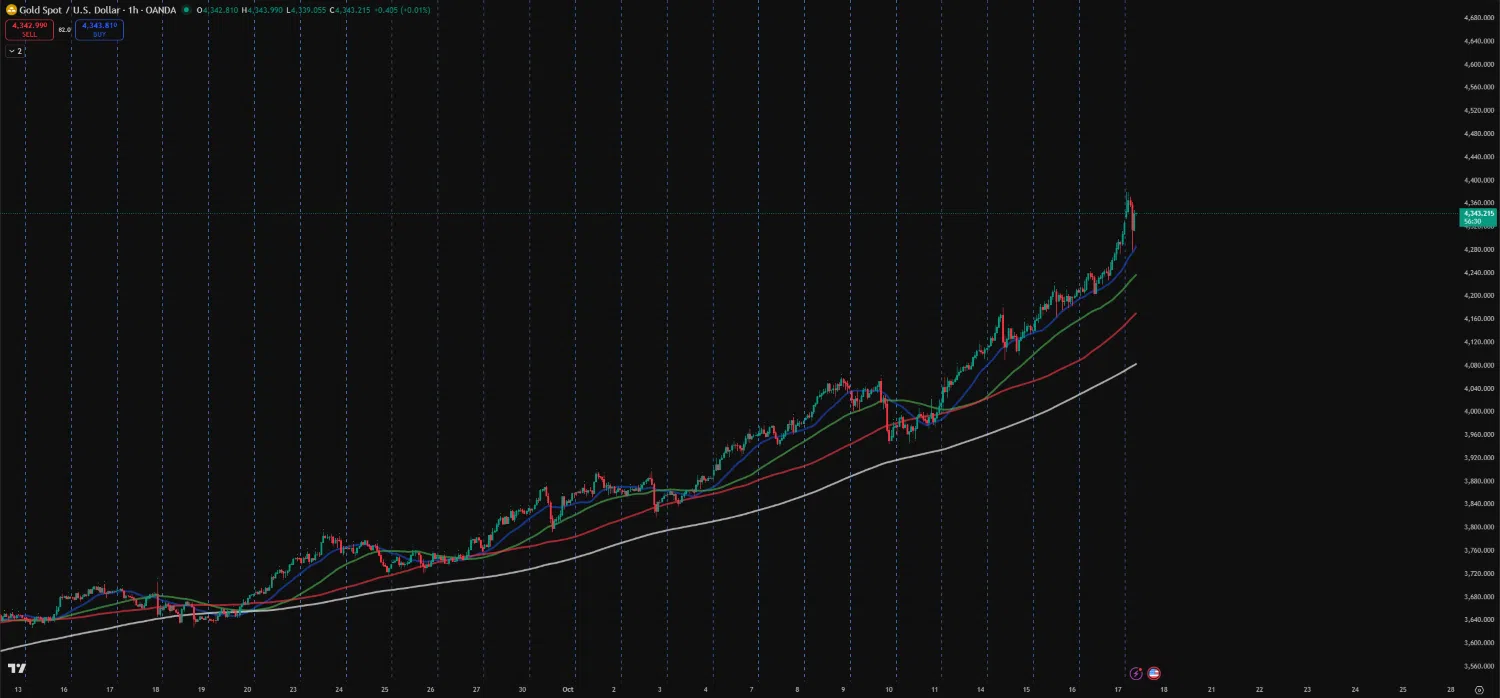 4-Hour (H4): ในกรอบเวลา 4 ชั่วโมง ราคาอยู่ที่ 4,329.73 ดอลลาร์ โดยยังคงเทรนด์ขาขึ้นอย่างต่อเนื่อง ราคาซื้อขายเหนือ SMA21 และ SMA50 อย่างมั่นคง RSI ปรับลดมาอยู่ที่ระดับ 77.14 ซึ่งยังคงอยู่ใน Overbought Zone แต่ต่ำกว่า Daily ส่งสัญญาณว่าแรงซื้อเริ่มชะลอตัวบ้างในระยะสั้น MACD ที่ 68.59 ยังคงเป็น Bullish แต่ Histogram เริ่มลดลง ชี้ให้เห็นว่าโมเมนตัมเริ่มอ่อนแรงลงเล็กน้อย Stochastic แสดงสัญญาณที่น่าสนใจโดยเส้น K และ D เริ่มมีแนวโน้ม Crossover ซึ่งอาจเป็นสัญญาณเตือนการปรับฐานระยะสั้น